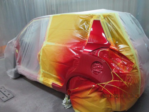 2 クオーターパネルをマスキングして給油口と一緒に調色した色で塗装をします。