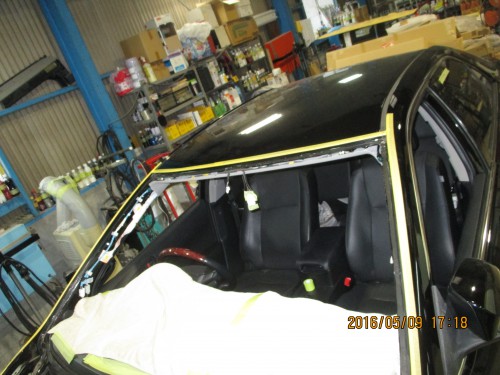 4 新品のフロントガラスに付属品を取り付け、専用のボンドを塗布してボディーに取り付けます。