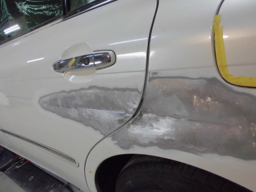 2 左フェンダーを板金しポリパテを塗布します。