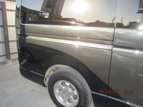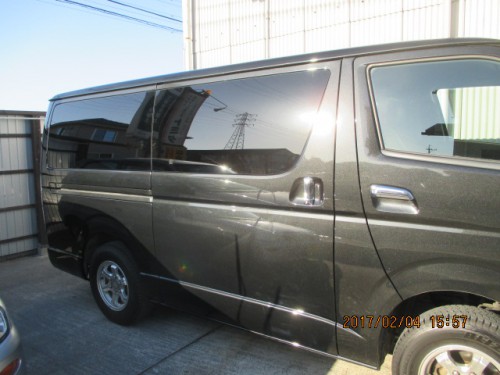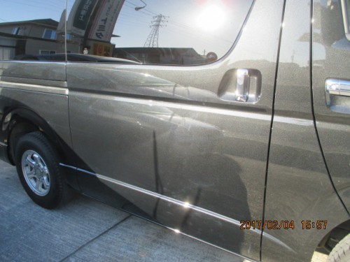 トヨタハイエース 右リヤ側面キズヘコミ実費にて板金塗装修理 0564-32-6961 〒444-0908 愛知県岡崎市橋目町大師25番地 土日祝営業! 営業時間 AM9:00〜PM8:00(ご来店前にご連絡ください)