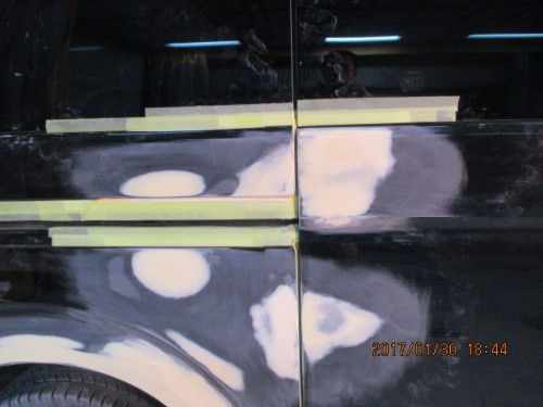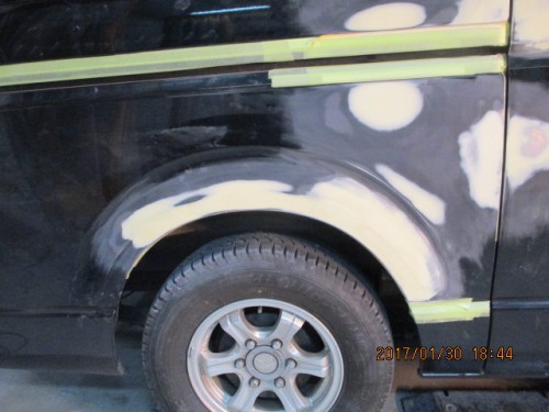 1 右スライドドア、右クオーターを板金してポリパテを塗布します。
