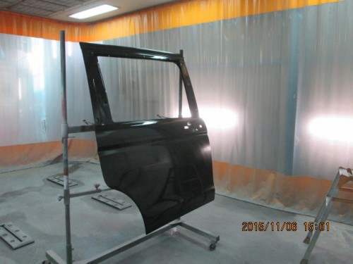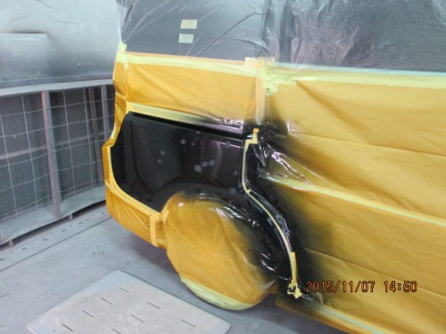 5 凹んだスライドドアを取り外し、クオーターをマスキングし、調色した色で塗装をしていきます。