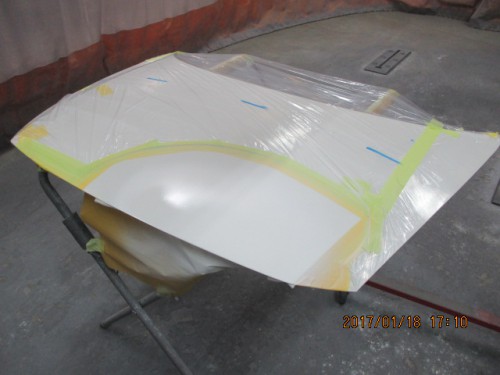 4 プラサフを塗装する範囲まで水研ぎして、ボンネットをマスキングしたら、プラサフを塗装します。