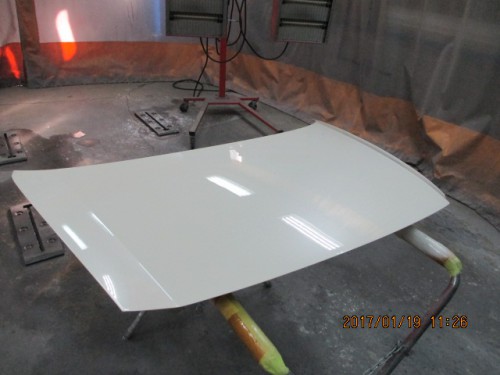 6 ボンネットをマスキングして調色した色で塗装をします。