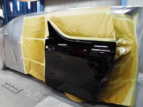 3 左スライドドと左クオーターパネルの傷へこみを板金をしてサフを塗装します。