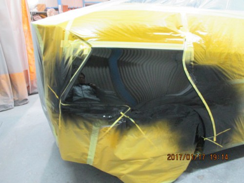 2 塗装する範囲をあしずけしたら、左右クオーターをマスキングします。