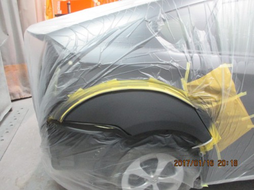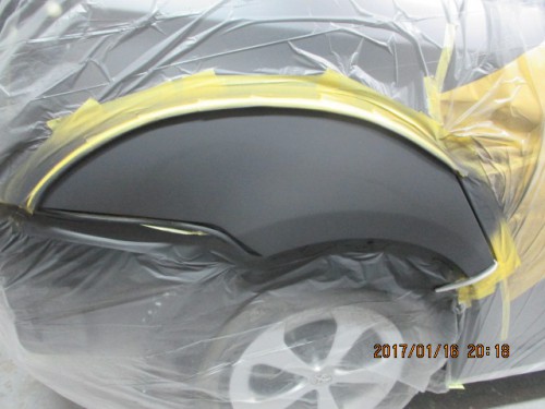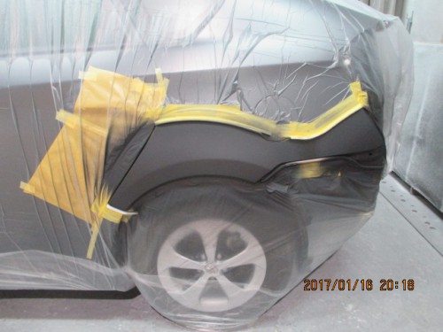 4 プラサフを塗装する範囲まで水研ぎして左右クオーターをマスキングしプラサフを塗装します。