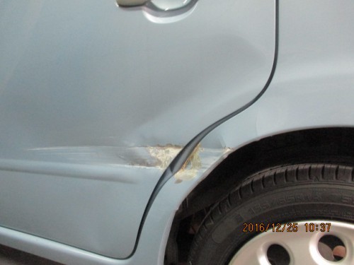ダイハツミラココア 左リヤ側面事故 実費にて板金塗装修理 0564-32-6961 〒444-0908 愛知県岡崎市橋目町大師25番地 土日祝営業! 営業時間 AM9:00〜PM8:00(ご来店前にご連絡ください)