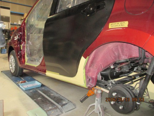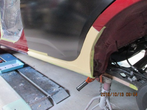 3 左リヤドアと左ロッカーパネル、左クオーターパネルアーチ部の事故した部分の塗装を剥いでいきます。