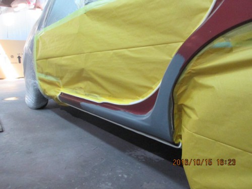 1 クオーターパネルをマスキングして調色した色で塗装をします。クオーターパネルの塗装が乾燥しましたらごみやブツ…