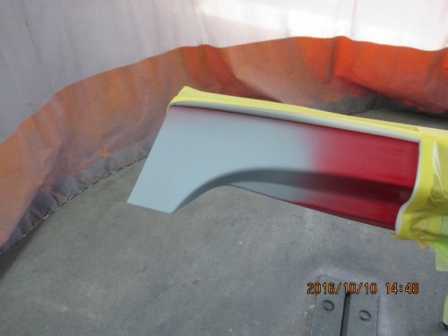 1 左サイドエアダムを取り外し、傷を水研ぎしたら、マスキングをしてプラサフを塗装します。 2 左リヤドアのへこ…